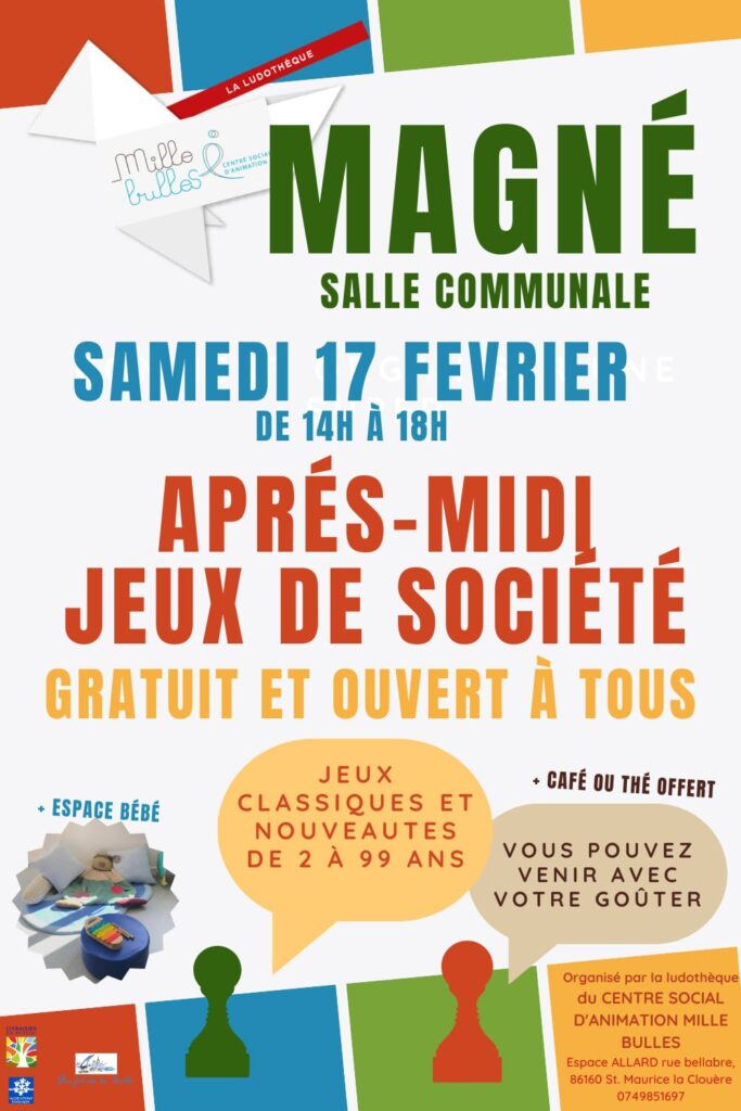 Le centre social d’animation Mille Bulles organise un après-midi dédié aux jeux de société samedi 17 février à la salle communale, de 14h à 17h. Entrée gratuite et ouverte à tous. Venez nombreux !
