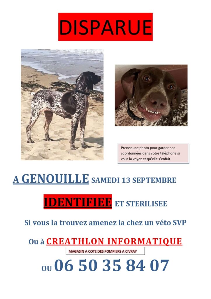Comme toutes les communes du Civraisien en Poitou, nous vous communiquons la disparition d’une chienne braque allemand le 13 septembre à 20h00 sur la commune de Genouillé (86250). Elle est tachetée marron et blanche (truitée), est identifiée par puce électronique et est stérilisée. Pour tout signalement, veuillez vous référer à l’affiche ci-dessous.