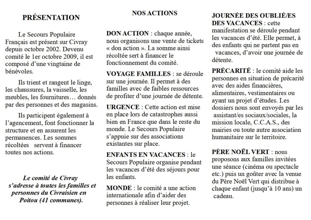 Vous trouverez ici la nouvelle plaquette d’information sur les différentes actions du Comité local de Civray du Secours Populaire ainsi que les communes concernées.