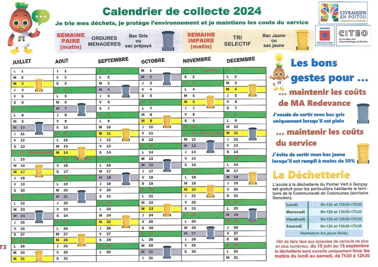 Calendrier de collecte des ordures ménagères pour l’année 2024
