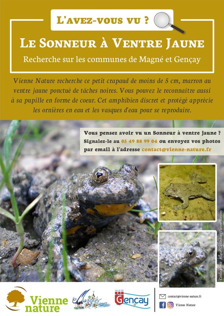 Nous relayons le message de Vienne Nature concernant une campagne de recherche du Sonneur à ventre jaune. Il s’agit d’un petit amphibien protégé pouvant être présent sur les communes de Gençay et Magné, notamment aux abords de la Belle, d’après plusieurs témoignages reçus récemment.